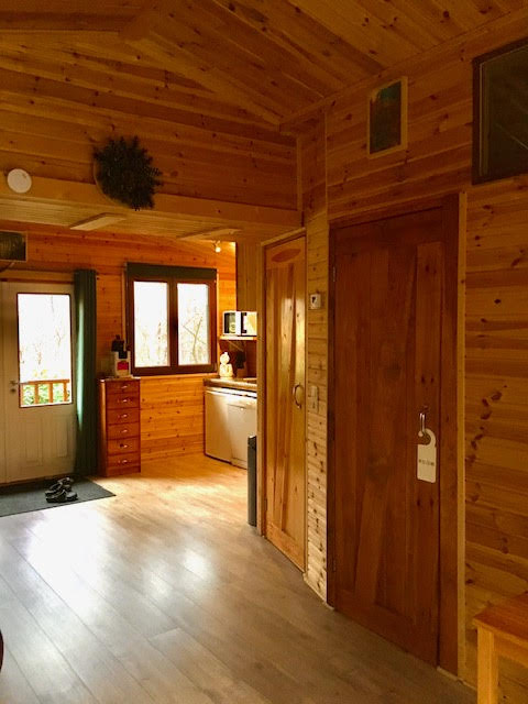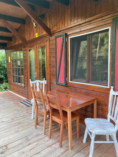 Het chalet heeft zowel aan de voorkant als aan de achterkant openslaande deuren. Het zonnetje komt op aan de voorkant van het chalet, zodat u al vroeg in het voorjaar heerlijk op het overdekte terras aan een houten eethoek van uw ontbijtje kunt genieten. Van de zonsondergang kunt u dan weer op het achterbalkon genieten, met natuurlijk uitzicht op het bos.
